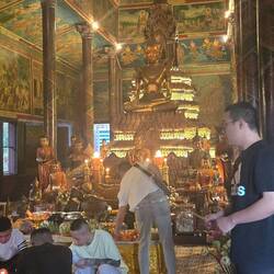 Nearby us is an island of peaceful serenity in the midst of the cacaphony: the Buddhist temple of Wat Phnom Daun Penh. It sits upon a hill with a working clock embedded into it. It's lovely, with beautiful gardens and floral offerings at the many small shrines along the way up the hill. Wat Phnom means Mountain Pagoda, and the construction is said to have been completed in 1372. Incense hangs heavily in the whispery air, as offerings are made.