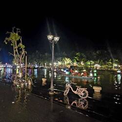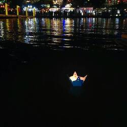 My heart sinks. This, this big clunky flat bottom boat, with gaudy electric lanterns, this isn't the graceful, glowing water craft I saw myself in at all! And yet. It's on me. They did not misrepresent as much as we didn't confirm. I know better! So, a little ruefully, we make the most of it. Still on the dark Thu Bon river with rainbow orbs all around us. Still tiny flamed paper lanterns bravely dip and dance around the boats. Still good.