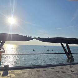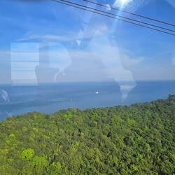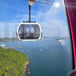My prior eagerness for the experience is diluted at the first launch point. The point where the cables creak along with your full cabin - wait, this must be really heavy - immediately slant steeply uphill....and then launch you, over the treetops, to a dizzying view of turquoise blue sea. The mainland is almost 8km away. My nerves calm as we sail over ships, our shadow crossing their wake. The ride is smooth, even over the transiting towers. I checked on this, it's Austrian and Swiss engineered which is reassuring.