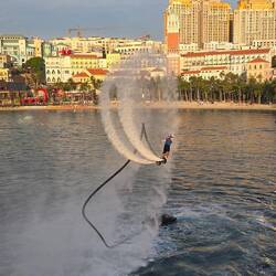 And here, from the famed Kiss Bridge, which has two gently sloping sections that almost but not quite meet, we see the sunset show. Performances by jet ski and small motor boats are the backdrop to the fly board show. These water jet pack propelled athletes are incredibly acrobatic performers. Another moment of patriotic pride, as the announcer presents the Canadian fly board champion is in tonight's show, Geoff Hulet.