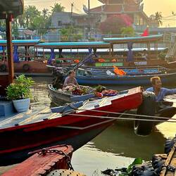 At least today we can enjoy the sounds and colors, watch the expert weaving and bobbing of boats. If a coffee or juice, a pineapple or a potato is wanted, a vendor is easily beckoned over. A quick tying on secures their boat to yours to complete the transaction.