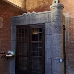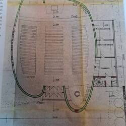 Ein freistehender Mauerwerksbau mit Flachdach und großflächigen Eisen-Glas-Fenstern, die den Krümmungen des Grundrisses in Form dreier, ineinander verschnittener Kreise folgen.