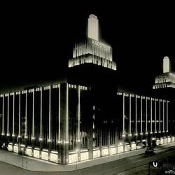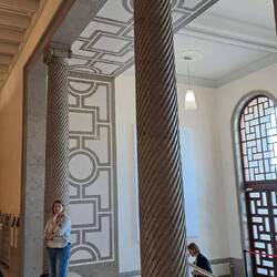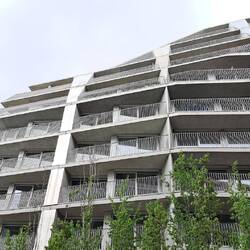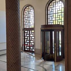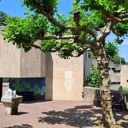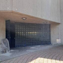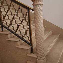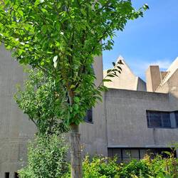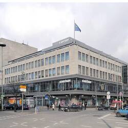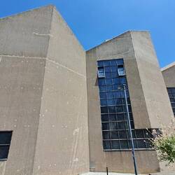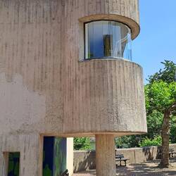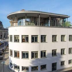 Bauweise: Stahlbeton-Skelettbau mit Muschelkalkfassade