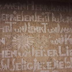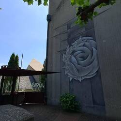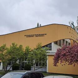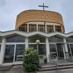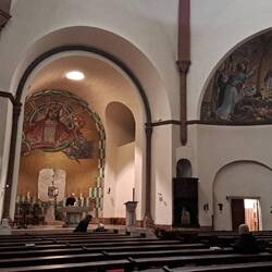 Grundstein 17.9.1936, Turmloser Bau mit Vereinsgebäude, Kirchentrakt befindet sich hinter dem Vereinshaus und ist nur von den Seitenstraßen aus zu sehen. Das umlaufendeLeggi altro