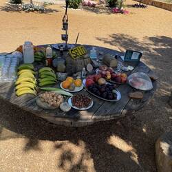 Easy day walking today, about 12 miles. Not much in the way of scenery until we got to the town we’re staying in. Except I included a picture of one of the giant picnic tables common at rest areas/town picnic areas along this part of the Camino. They look big enough for food for everyone with room for dancing in the middle!