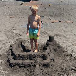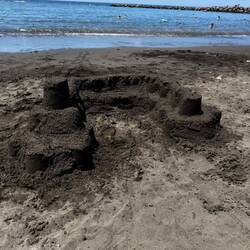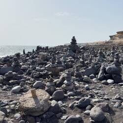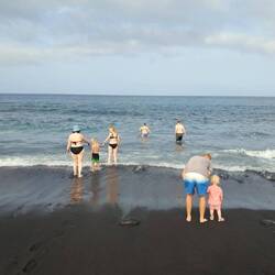 Nach dem Frühstück ging’s zum Strand. Eher steinig. Direkt am Meer jedoch schwarzen Sand.