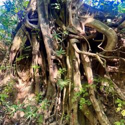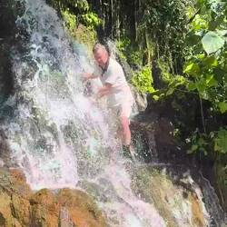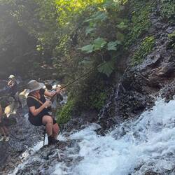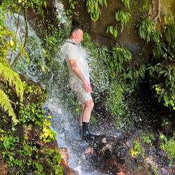 Man gan vēl atmiņā iepriekšējā paslīdēšana, bet nevar jau vārguli tēlot. Tā nu trīcošām kājām rāpjamies augšā līdz virves galam. Tagad Eri paziņo, ka turpmākais ceļš jāveic bez virves atbalsta, jo esam atstājuši labu iespaidu. Tad vēl tālāk – jārāpjas pa tādu stāvu sienu, kuru citas grupas apiet pa lēzēnāku nogāzi. Kājas ir stīvas, vēders sarāvies čokurā, uz galvas visu laiku līst ūdens, bet atpakaļceļa vairs nav. Kad liekas, ka nu jau viss pārdzīvots, Eri paņem pie sevis mūsu somas, jo tagad būšot pilnībā jāiet cauri lielajam ūdenskritumam (sk. video). Ūdenskritumu skaits mums jau ir sajucis.