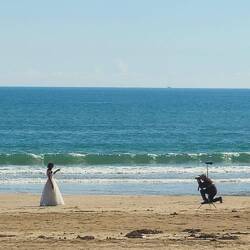 Sonne 🌞 tanken, denn die nächsten Tage sehen nicht so dolle aus. Eine Braut posiert am Strand, Menschen genießen die Wärme am Strand, zu Wasser, oder einfach auf einer Bank.