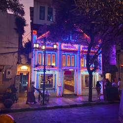 The building was so unique in the surroundings, as high rise buildings towered above it, yet it was a beacon of light in the evening that many flocked to.