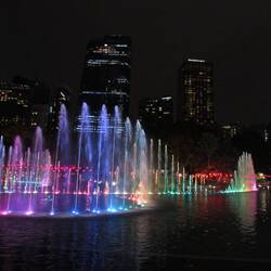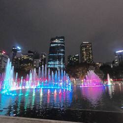 Lit up in the evening they looked almost CGI against the skyline. There was a shopping centre behind that we wandered through to get to the park and lake so we could watch the light show.