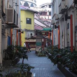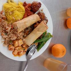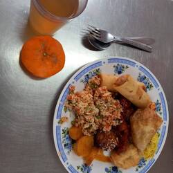 Almost all locals visiting for prayers, and the restaurant got very busy. Some lovely locals helped us to find the restaurant and get the food! Buffet style with all vegetarian dishes we enjoyed potatoes glazed with soy sauce and sesame seeds, spring rolls, tofu in tomato sauce, fried rice, chai sui "pork", fried "chicken" wing and nutmeg tea. Delicious feast, costing around £6 total.