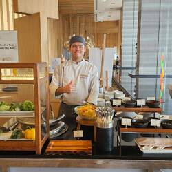 Den gestrigen Reisetag hatten wir gut überstanden und gingen erst spät abends zu Bett. Der Körper holt sich, was er braucht, sagt man. Das scheint zu stimmen, denn erst um 10.00 werden wir heute, am Day 2, wach. "Vite, vite", denn um 10:30 endet die Frühstückszeit. Wir sitzen im 11ten Stock am Panoramafenster und kommen aus dem Staunen kaum raus. Die Aussicht, der Umfang des Buffets, der super nette Service. Wir frühstücken asiatisch und starten mit der spicy noodle soup with fish balls.
