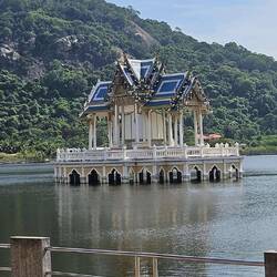 Wir fahren zur Train Station, dem ältesten Bahnhof Thailand's. Daneben steht einer der neuesten Bahnhöfe Thailands in königlichem Farbanstrich. Tatsächlich verbringt die Königsfamilie in Hua Hin Zeit in ihrem Sommer Palast. Der Bereich um den Palast ist sehr weiträumig abgesichert. Bei Google Maps eingetragene Straßen sind einfach gesperrt.