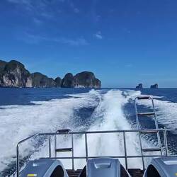 Das Programm geht pünktlich um 8.00 a.m. mit der Abholung am Hotel los. Ein "VIP" Bus bringt uns zur PHUKET BOAT LAGOON MARINA, von wo die Speedboats ablegen. Zügig geht es auf die Speedboats, 15 m lange Boote, die mit 3 × 250 PS Honda Außenbordern BF250 ausgestattet sind. Das sieht schon mal gut aus. Wir nehmen auf der hintersten Sitzreihe direkt vor den Motoren platz. Wo sonst? 3,6 l Hubraum, 6 Zylinder, 6300 U/Minuten. Und das leistet jeder einzelne Motor. 18 Zylinder mit knapp 11 l Hubraum treiben uns an. Allein die Leistungsdaten zaubern ein unwillkürliches Lächeln in mein Gesicht. Langsam tuckert das boot aus der MARINA und dann, am Ende der Lagune, geht es los. Die 3 Motoren schreien auf, der Bug schnellt in die Höhe. Festhalten ist angesagt. Mit Maps und GPS verfolgen wir unsere Fahrt. 60 km/h schnell rast das Speedboat über die leichten Wellen. Weitete 2 Boote fahren gleichzeitig mit uns los, das Rennen beginnt. Ein Erlebnis für Motorsportinteressierte, eine Tortur für die Indische Familie, die zu acht auf dem Speedboat versuchen zu sitzen. Aufstehen und über den Bug schauen geht nicht. Zu hoch ragt der Bug aus dem Wasser. Die Honda Motoren drehen, der 32°C heiße Fahrtwind umspült unsere Körper mit 60 km/h, das Festival der Freude tobt. Wir haben eine super Sicht über das Heck. Nicht nur auf die Motoren, sondern auf die traumhafte Inselwelt. Das muss man erleben! Die Bilder, die man aus den Reise Apps sind nicht gefaked. Es ist einfach traumhaft. Echt cool. Nach einer knappen Stunde gehen wir vor Phi Phi Don schnorcheln. Wir schwimmen nah nebeneinander und teilen unsere Freude bei der Entdeckung versteckter Fische. Nachmittags geht es zur MAYA BAY, wo auch Leonardo DiCaprio schon mal baden war (THE BEACH, gedreht in 2000). Heute ist das Schwimmen in der Bucht verboten. Ich würde hier auch ohne die vielen Warnhinweise nicht freiwillig Schwimmen gehen. In der Bucht wachsen Haie auf! Man kann sie ihre Kreise ziehen sehen. Und wo aufwachsende Haie sind, ist der Weiße bestimmt nicht weit weg. "No way" gingen wir da rein. Die Bucht ist ein Spot. Die Instagram Mädels und Jungs stehen mit der knappesten Bademode zum Shooting mit den Füßen im Wasser. Schuhe trägt man nicht, die könnten von den Haien ja gefressen werden.