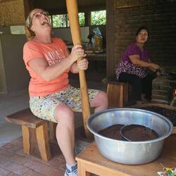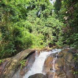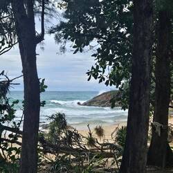 KHAO LAK- LAM RU Nationalpark. Wir bekommen ein Blatt Papier mit einer aufgezeichneten Runde durch den Park zur Orientierung und die Anweisung "Go straight, turn left and Small Sandy Beach in 1.2 Kilometer, stay on the trail". Wir legen los. Es geht direkt zum Meer runter. Die ersten 20 Höhenmeter sind geschafft. Der Trail ist so breit, dass man mit für Thailänder typischen Schuhgröße 32 gut laufen kann. Mit größeren Füßen muss man ziemlich gut aufpassen, dass man sich nicht die Füße verdreht zwischen den vielen Wurzeln des Tropenwaldes. Die Trails sind jetzt, zum Ende der Regenzeit, stark ausgespült, die tausend Wurzeln liegen frei. Es geht immer 10- 15 Höhenmeter steil bergauf und direkt wieder bergab. Beeindruckend ist die Pflanzenvielfalt und die unglaubliche Größe der Pflanzen und Bäume. Der Weg wird zunehmend steiler. An besonders steilen Stellen sind dicke Seile als Sturzsicherung angebracht. Im Ernstfall würden diese aber nichts halten, denn die Pfosten, an denen die Seile befestigt sind, schweben teilweise über dem Boden. Und weil die Seile schon bei "trockenem Regenzeitwetter" durch die Hand glitschen, wären sie bei Regen nutzlos. Und das erfahren wir...., denn es beginnt auf halber Strecke zu regnen. Der lehmhaltige Boden wird zu Schmierseife, auf den Wurzeln findet man keinen Halt. Gegenseitige Hilfestellung ist gefragt. Der Trail wird noch schmaler, noch steiler. Unsere Stunds überleben wir und stellen uns am Ende des Trails in einer Strandhütte unter. Nach 40 Minuten gehts weiter und zurück über eine begestigte Straße.