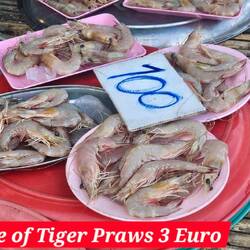 Wir bleiben verschont! Aber eigentlich sind wir plötzlich garnicht mehr so Tempel interessiert..... oben angekommen sind nur Hunde und Affen.... und wir, mit dem Moped. Gut, dass das Moped einen guten Anzug hat.... schnell geht es durch die wartenden Affenherde den Berg hinab. Wir halten am Fischmarkt. Hier scheint die Makaken Schule zu sein. An den Stromleitungen sieht man überall Jungtiere. Wir bleiben mutig und gehen Streetfood essen und werden belohnt für unsere Unerschrockenheit. 1 kg gegrillte Tiger Prawns oder 12 Stück als Mittagessen für 400 Baht. :-) 12,50 Euro/kg gegrillt und serviert. 40 Minuten zurück zum Hotel mit unserer HONDA 160 cc PCX , neuestes Model. Abends zum Night Market Hua Hin und Streetfood.