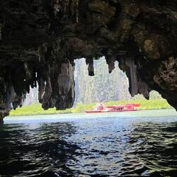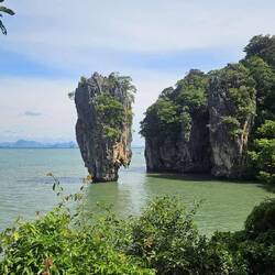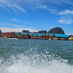 JAMES BOND ISLAND Ausflug mit dem Longtail Boat. Um 7.45h steht der kleine Van vor unserem Hotel. In einer Gruppe von nur 8 Personen fahren wir 1,5 Stunden zur Phang Nga Bay, steigen um ins Longtail Boat und genießen von der ersten Sekunde die traumhafte Landschaft, fahren nah an Mangroven vorbei und rammen um ein Haar einen Waran, der genau neben uns seinen Kopf zeigt. Unser Guide macht ein Witzchen..... "he might jump into the boat" worauf eine Dame eine Reihe hinter uns feststellt, wir sollten doch unbedingt sofort! weiterfahren. Ein bisschen Fun muss sein. Der James Bond Felsen bzw. die Insel KHAO TAPOO kommt näher, das Wetter spielt mit, und wir haben das Glück, dass erst wenige Touristen vor Ort sind. Dennoch posieren schon viele in aktuellster Instagram Pose vor dem JAMES BOND Felsen. Etwas später steigen wir um auf 2er Kanus mit Paddler und fahren in Höhlen und durchfahren dichte Mangroven Wälder. Beeindruckend. Die schwimmende Stadt mit 500 auf Pfählen stehenden Häuschen und ca. 2.000 Bewohnern besuchen wir auch; beim Durchgang durch die Gassen wird man angebettelt und, zum Wecken des Kaufinteresses, angefasst. Wir gehen! In einer kleinen Gruppe macht der Ausflug Spaß. Von einer großen Tour mit 20 oder 30 Teilnehmern raten wir ab.
