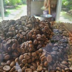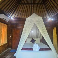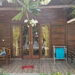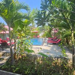 NUSA LEMBOGAN hat die schlechtesten Straßen. Straße definiert sich hier eher als "teils fester Boden, der durch starke Regenfälle regelmäßig völlig ausgewaschen wird". Die Straßenbreite beträgt durchschnittlich 3 m, Platz für immerhin 3-4 Mopeds gleichzeitig in eine Richtung. Begegnen sich zwei der hier gefahrenen schmalen ISUZU Transporterchen, bleibt einer stehen, der andere quetscht sich vorbei. Mein Geschäftsmodel wäre hier "flexible Außenspiegel verkaufen". Weil aber alle Indonesier sowieso nur nach vorne gucken, spielt ein abgefahrenrr Außenspiegel keine große Rolle. Bei einem Unfall ist immer der Hinterherfahrende schuld. Es wackelt kräftig hinten auf der Ladefläche, die Straßen werden noch enger, Palmenblätter schlagen auf die Ladefläche und plötzlich stoppt das Taxi. Wir sind da. MUSHROOM BAY. Wir schauen uns nur fragend an und um...... wo, bitte, ist hier ein Hotel namens NADRAS? Der Eingang ist unscheinbar und wird durch einen Hindu Schrein verdeckt. Dahinter ist die Welt