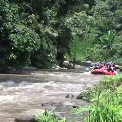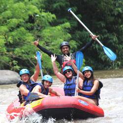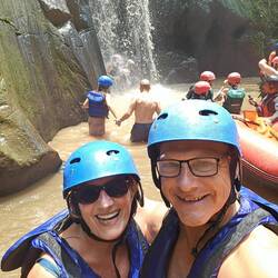 AYUNG DERAWATA RAFTING: Wir warten auf zwei bis vier andere Gäste, damit unsere Bootsbesatzung vollzählig ist. Ein Honeymoon Paar aus Bahrain gesellt sich zu uns. Von der ersten Sekunde an haben wir 4 Spaß. Nach kurzer, spannender Fahrt zu 5. auf der Ladefläche eines Mini-Suzuki-Transporters laufen wir ca. 400 Treppen (ungleich hoch, rutschig, wackelig) zum Ayung river hinunter. Unser Skipper an diesem Tag ist DAREK, der uns die Kommandos erklärt. Paddel , Stop, Paddle up und wiggle wiggle. Unsere Honeymooner, Muslime, beteuern, wie wichtig wiggle wiggle ist und die Crew lacht. Es wird eine super lustige aber auch spannende 10km Rafting Tour. Der Fluß AYUNG mit den vielen Stromschnellen und die gewaltige Natur mit den Affen und bunten Vögel machen unsere Tour zum Tropenerlebnis.
