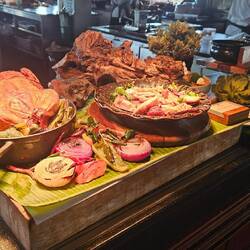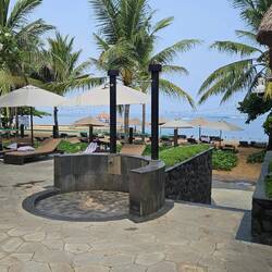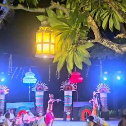 BALINESE CULTURE NIGHT: Balinesische Musik erklingt zum Auftakt der Tanzveranstaltung direkt am Strand in unserem Hotel. Eine solche touristische Veranstaltung stand auf unserer Bucket List, heute ist es soweit; wir wollen eine solche touristische Attraktion einmal miterleben. Die Musik begleitet die Tänze, die Teil der religiösen und künstlerischen Identität des balinesischen Volks sind. Die Tänzer drücken die Inhalte der Tanzdramen durch Mimik, Körpergestik vom Kopf über die Hände bis zu den Zehen aus. Die bunten, teil schrillen Kostüme schillern im Licht der Fackeln. Mystik kommt auf (wenn man sie zulässt). Unser typisch balinesisches Dinner wird auf einer rot-goldenen zweistöckigen Etagere angerichtet. 12 verschiedene Speisen von Satay Spießen über Nasi Goreng, chicken in Pandanblättern bis scharfe Sambalgerichte werden präsentiert. Es schmeckt hervorragend und das Auge ist mit.Read more