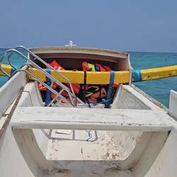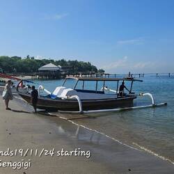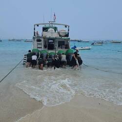Das Boot ist beladen.... und will sich, mit dem Heck auf dem Strand liegend, nicht ins Wasser schieben lassen. Die 6 Scoot Angestellten schaffen es nicht, das Boot über die erste Strand Welle zu bewegen. Erst als 4 Gäste zusätzlich Hand anlegen, bewegt sich das Schiff. Los geht's!