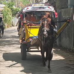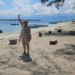 JUKUNG heißt das typische balinesische hölzerne Ausleger-Kanu. Mit einem solchen Boot fahren wir am 3. Tag zu den GILIS zum Schnorcheln. Schon beim ersten Stopp bei GILI T sehen wir eine (grüne) Schildkröte, bute Korallen und schwimmen mit bunten Fischen. Unser Guide setzt uns zur Stippvisite auf allen drei Inseln ab. Autos gibt es auf den Inseln nicht. Richtige Straßen auch nicht. Auf Gili T sehen wir die CIDOMO, Pferdekutschen im Einsatz. Einmal transportieren sie Menschen, die irgendwie neben ihren Koffern Platz finden, andererseits Baumaterial. Es sind hier tägliche Nutztiere! TIERWOHL hat hier keine Bedeutung. Abends und nachts mögen die Bars die Straßen glitzern lassen, tagsüber sieht man die reale Gili Welt. Das vorherrschende Abfallproblem, die armen Menschen, wie sie in offenen Holzverschlägen leben, die überdeutlichen Spuren der letzten Stürme. Das muss man wissen, wenn man hier unterwegs ist. Auf Meno bleiben wir 2 Stunden in einer Strand Warung sitzen. Arbeiten also wie die hier sitzenden 2 Auswanderer aus Australien. Das Garnichtstun ist aber nichts für uns. Wir tauchen wieder ein, in die Wasserwelt und dürfen eine große Meeresschildkröte 15 Minuten begleiten. Wir schwimmen neben und über ihr, wir können sie anfassen, sie nimmt uns wahr. Achtung, kleine Schildkröten darf man nicht anfassen; sie haben nicht genügend Abwehrkräfte gegen die menschlichen Bakterien, die beim lieblichen Streicheln übertragen werden, sie schwimmen danach "Kiel oben". Wir beobachten sie beim Fressen und bei einigen Tauchgängen. Es ist ein schwebendes Glücksgefühl.