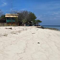 NUSA LEMBOGAN hat die schönsten Strände. Deshalb wohl gehen alle Ankommenden zuerst einmal durchs Wasser. Anlegestege gibt es nämlich nicht. Speedboote bringen einen in 30 Minuten von Bali (Sanur) entweder zum Jungut Batu oder Mushroom Bay Beach. Die Boote legen achtern am Strand an, man springt vom Boot oder nimmt die Minitreppe oder, wie eine mitteisende Holländerin meinte, die "so-nen-Kwatch-mach-ich-nich-mehr-Treppe". Bei 30° Wasser- und 33° Lufttemperatur bringt das Wasser keine Abkühlung. Und bei 95% Luftfeuchtigkeit bleibt die Hose auch nass. Das Gepäck wird von Helfern behutsam durch das Wasser, über den Strand zum Transporter getragen.
