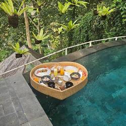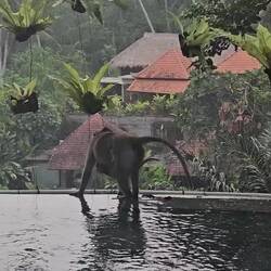 , einem für uns sehr besonderen Ort. UBUD stand nicht von Anfang an auf unserer Übernachtungsliste, wir hatten es als Tagesausflug geplant. Als der Plan dann aber reifte, stand auch gleich der Aufenthalt in diesem besonderen Hotel fest. Einmal im Urwald aufwachen. Einmal mit den Affen "baden". Einmal Villa mit Pool. Und, es kommt genauso! Unser Zimmer ist ganz am Ende des Resorts und das am höchsten gelegene in der Anlage. Wir sehen und hören einen Wasserfall und der Pool whirlpooled beleuchtet vor sich hin als wir unser Reich für die nächsten 4 Tage betreten. Wieder einmal sind wir geflashed. Was für eine Aussicht und diese Geräusche der Tiere.