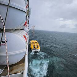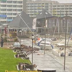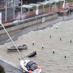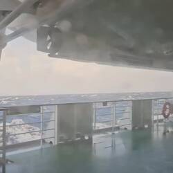 4. Das Restaurant "Markt" auf Deck 8 solle um 7.30h öffnen. Um 7.50h rumort die fast verhungerte Meute vor dem Eingangstor des Restaurants. Was ist los?Die Gäste stehen doch sicher und fest, einige umklammern das Eingangstor, damit das Rollen des Schiffes sie nicht umwerfen kann. Um 8h dreht unser Kapitän bei! 77 Knoten Windgeschwindigkeit, 8- 10 Meter hohe Wellen lassen das Schiff ordentlich schaukeln und rollen. Der Kapitän erklärt das Beidrehen mit der extremen Orkanlage. Das laute Schlagen begleitet von einem heftigen Ruck durchs ganze Schiff begründet der Kapitän mit Wellen bis zu 15 Metern Höhe!! Wir laufen die nächsten 7 Stunden mit Kurs 307 Grad. Wind und Welle kommen genau aus dieser Richtung. Unsere Geschwindigkeit liegt zwischen 5 und 0 Knoten. Wir wettern ab. Die ersten Nachrichten erhalten wir von Segelfreunden über WhatsApp. Fehmarn unter Wasser. Die ersten Bilder und Videos von der Ostsee erschüttern uns. Immer mehr Nachrichten erreichen uns. Videos mit sinkenden Segelschiffen, zerstörte Boote, zerstörte Steganlagen und Segelboote, die auf das Land gepuster wurden.