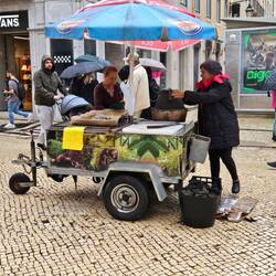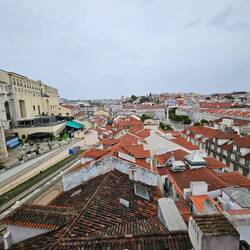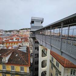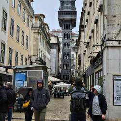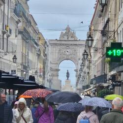Rua Augusta, Rua Aurea und die Rua de Prata. Dem Massenstrom "Aida Luna" weichem wir aus und entern die erste kleine, leere Straße. 10 Minuten später stehen wir vor der Burg São Jorge. Wie alle anderen. Wir drehen ab und kreuzen in der Altstad, Alfama. Romantisch, die kleinen steilen Sträßchen. Auf den Balkone stehen hier und da bunte Schaufensterpuppen. Warum das so ist, können wir nicht in Erfahrung bringen. Vielleicht will man die nächtlich umherziehenden Falada Sänger zu einem Ständchen animieren. Wir probieren die Eßkastanie aus der typischen Papiertüte. Wir probieren die kleinen Pasteis de Belém, leckere Kuchen mit Cremefüllung. Besonders gut sind die schwarzen, "verbrannten "; die, die besonders caramelisiert sind. Dolce Vita. Es geht zum Aufzug, von dem man von der Unter- in die Oberstadt gelangen kann. 15 Minuten Wartezeit besagt ein Schild. Wir laufen die Treppen und stehen nach 80 Stufen auf der unteren Aussichtsplattform. Herrlich, der Blick über die Dächer der Altstadt. Man kann die Kreuzfahrtschiffe an dem Terminal sehen. Hurtigruten Cruises, Costa Firenze und die Luna. Wir gehen Richtung Praça do Comercio und passieren de Triumph Bogen.