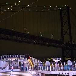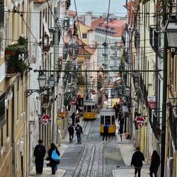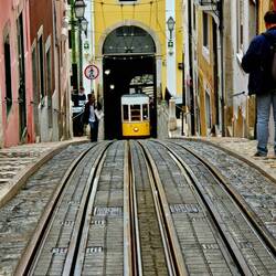 1. Die Unterquerung der BRÜCKE DES 25. APRILS ist das erste Highlight des Tages. Erstens, weil die Brücke nicht nur an die Hängebrücke in Los Angeles erinnert, sondern ein und der gleiche Architekt für die Architektur beider Brücken verantworrlich war. Die Geräusche der die Brücke überfahrenden Fahrzeuge werden lauter und lauter je näher man an die Brücke kommt; das liegt an der gelochten Fahrbahn. Fahrzeige mit breiten Reifen fahren in C-Dur, Fahrzeuge mit schmalen Reifen in G-Dur. Auf der rechten Seite der Flussmündung des Tejos überragt die Christus Statue.