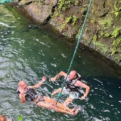 4. TI TOU GORGE ist eine Felsschlucht an deren Ende ein Wasserfall liegt. 7 von 8 unseres Adventure Teams entscheiden sich für den "5/7 Marathon": 5 bis 7 Minuten schwimmen, staunen und mit der Strömung zurück zum Ausgangspunkt. Wir bekommen Schwimmwesten, die wir tragen müssen. Im Verbund schwimmen wir gegen die Strömung. Die Felsen über uns sind hoch. Das Tageslicht fällt hier und da aber ein. Vor dem Wasserfall muss man gegen die Strömung ankämpfen. Und dann der Wasserfall, aus rund 8-10 m über uns "stürzt" das Wasser auf uns zu. Tatsächlich bildet sich darunter ein merklicher Strudel. Mit der Strömung geht es zurück. Ein tolles Erlebnis!