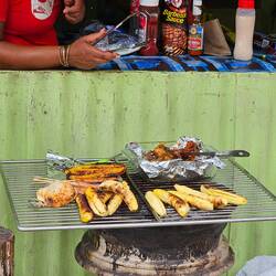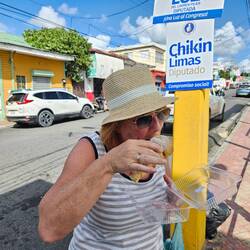 An einem Straßenverkauf bekommen wir alle lokale Früchte zum Probieren. Und: den karibischen Rum Punsch. Jetzt wird noch mehr gelacht.