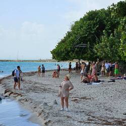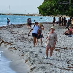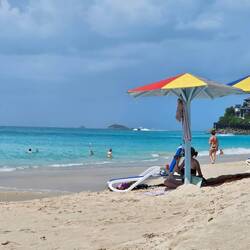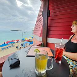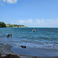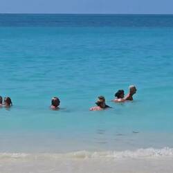 Kurz nach der Schiffsfreigabe passieren wir den bunten Heritage Quay und gehen einmal quer durch die bunte, laute Stadt direkt zum Wochenmarkt. Wir schlendern durch die Gassen des Marktes und obwohl jeder sieht, daß wir als Kreuzfahttouristen nichts kaufen werden, zeigt man uns unaufgefordert die besonderen Fische des Tagesfang. Einen ca. 2 Meter langen Thunfisch und einen kleinen Hai neben unglaublich vielen bunten anderen Fischarten. Nett sind die Menschen hier. Wir gehen zu den Sehenswürdigkeiten; wenn wir es nicht im Reiseführer gelesen hätten, wären wir an dem Museum of Art, der St. John's Cathedral und am Gouvernment House vorbei gelaufen. Das Sehenswerte sind die Menschen, das turbulente Treiben, die Interpretation von Verkehrsregeln und die extremen Höhenunterschiede zwischen Verkehrsstraßen und Gehwegen damit mögliche Wassermassen bei Starkregen ablaufen können. Nach knapp 2 Stunfen gehen wir zum Bus Terminal und nehmen die Herausforderung an. Taxibusse verkehren auf der Insel und Haltestellen gibt es nicht. Mann oder Frau winkt wenn man mitfahren will und ruft dem Fahrer ein lautes STOPP please zu, dann passt das schon. 3 East Carribean Dollars kostet die 15 minütige Taxifahrt zum DARK BEACH. Dort treffen wir 6 Freunde unseres Expeditions Teams, die eine Rundreise um die Insel per Kleinbus gemacht haben. Wir gehen bei 29 °C Wassertemperatur! baden.