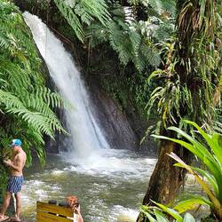 Unser Adventure Team nimmt einen Kleinbus, der uns einmal quer über die Insel zum "Réserve Custeau" am Malendure Strand bringt. 35 Minuten Fahrt, ersteinmal durch die schmuddelige Stadt Point - à- Pitre und dann über teils schlechte Straßen durch den Regenwald. Am Strand gehen wir 1 Stunde baden. Weiter gehts zu einem Wasserfall, dessen Zugsng wegen des heutigen Feiertags (Allerseelen) verschlossen ist. Einen zweiten Wasserfall besichtigen wir. Nix besonderes. Der Fahrer spricht nix Englisch aber karibisch-französisch, weshalb die Unterhaltung insgesamt erschert ist. Am Souvenir Stand spielt eine Combo! Das Video müsst ihr Euch ansehen. Bis heute bereits 1,2 Mio Klicks. Eine Tournee ist in Planung. :-)