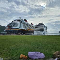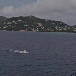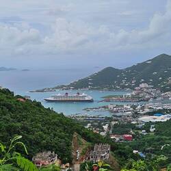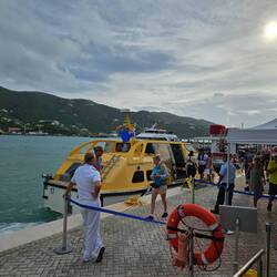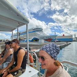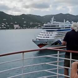 Um 5.45 erreichen wir den SIR FRANCIS DRAKE Channel und nehmen Kurs auf TORTOLA. Es ist spannend, denn wir passieren viele Inseln mit sehr geringem Abstand.Als ROAD TOWN hinter dem letzten Berg erscheint, sehen wir die Aida Diva und die Disney Dream am Quay liegen; für uns gibt es keinen Liegeplätze am Kai. Eine Stunde später liegen wir vor Anker und die Tender Boote nehmen die Arbeit auf. Unser heutiger Ausflug heißt "Tortola zu Land und zu Wasser". Wir fahren mit einem Safari Bus über die Insel Richtung Norden und dann Westen. Viel zu sehen gibt es nicht, außer vielen Resten des letzten Hurricans (2017). Sportboote tauchen plötzlich abseits des Wassers im zerstörten Wald auf; neben der Straße plötzlich riesige Monolithe, sie scheinen nur von einer Baumwurzel gehalten zu werden. Schrott liegt überall. Die Natur ist unglaublich dicht und vielfältig; die Straßen sind eng und wenn nicht Schlaglöcher die Geschwindigkeit auf Null reduzieren, dann sind es "speed bumps"; Hindernisse, die die Federung des Fahrzeugs einmal stresstesten. Gut geschüttelt erreichen wir im Westen der Insel die Marina mit dem Anleger "West End Ferries". Wir entern einen Highspeed Katamaran und fliegen über den Sir Francis Drake Kanal. Fun pur. 25 Minuten später erreichen wir Peter Island, eine Privatinsel mit Hotelanlage. Es soll die Bucht der Reichen und Schönen" sein und damit man unter sich bleibt, kostet eine Übernachtung ab 8.000 US$. Mit Frühstück!