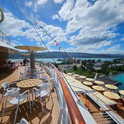 2. Die Inseln Ilhas Desertas (Würsteninseln) und die Ilhas del Salvagens (Wilde Inseln) hatten wir zuvor passiert und laufen in Funchal ein. Einmal auf dem Teller gedreht, legt die Luna in Steuerbord an. Die Sonne scheint, Zeit fürs Frühstück außen auf dem Restaurant Deck. Jetzt spätestens ist für uns der Sommer zurück.