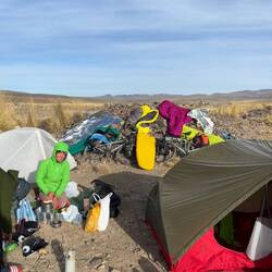 Trotz Rettungsdecken, 2 Isomatten und dicken Schlafsäcken haben die beiden Larissas sehr stark gefroren. Normalerweise friere ich nachts gar nicht, doch auch in dieser Nacht hatte ich Gänsehaut und bin oft aufgrund der Kälte aufgewacht. Morgens hatten wir alle eine Eisschicht auf unseren Schlafsäcken, an unseren Zelten und natürlich auch an den Rädern. Daher sind wir erst aus dem Zelt gekrochen, als die Sonne bereits da war und haben uns dann erstmal Tee gekocht und unsere Sachen trocknen lassen.