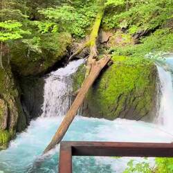 We continued down through the forest, mostly shelter from the rain stopping at a second dramatic waterfall, with an amazingly blue pool at its foot.