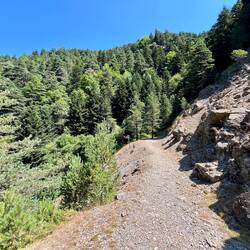 Ordinary cars have to be parked in the spacious car park about 9km from the village of Es Bordes. From there, we took the tourist train 3 more km up to the plain in the centre of the valley, close to a Refuge or mountain hut. We had debated whether to take the train up or down, and to walk in the opposite direction - we opted for the former and were very pleased when we saw the steepness of the remaining climb up to the plain.