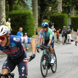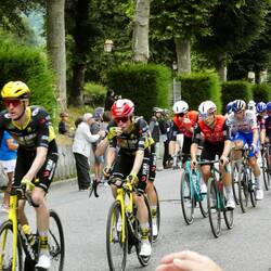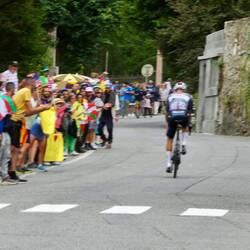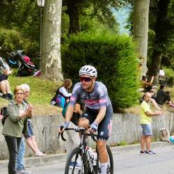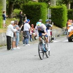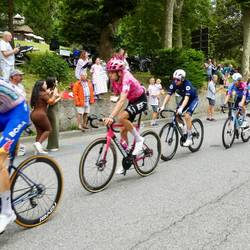 The next few riders came along in a small group, then a few individuals, and then some larger groups, including Tadej Pogocar, the current wearer of the Maillot Jaune (Yellow Jersey) surrounded by teammates, and then a little later a group including Brit Geraint Thomas.