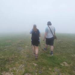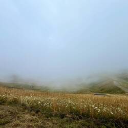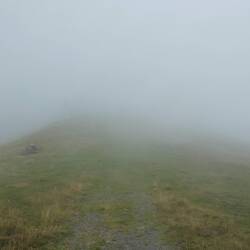 As we continued along the ridge leading away from the resort buildings, the cloud grew thicker and more dense, but then in moment would clear a little, perhaps offering a glimpse of the views or at least allowing the sun to shine down. We did however see a raven flying around in the cloud, making its unmistakable “crinkle-cronk” call. It was, alas, too quick to capture a photo.