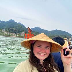 The first thing that took us by surprise was that there were deer everywhere just wondering around and completely unbothered by people which was quite lovely! Trying to leave a decent distance between us and the deer we took a few snaps and then headed around the island to see the Torii gate that was in the sea! Very similar to the one we kayaked to but obviously this one is much more popular. We climbed onto a small rickety boat with no other forgien tourists and were passed the large and rather comical on us bamboo hats! Before heading out for a better view of the torii gate, this time we were actually taken through the gate which I was surprised by as we weren’t allowed to kayak through the last one! But it did mean we got a very close up view of the rustic red gate whilst our guide gave us what I’m sure was a very interesting and in depth description in Japanese!