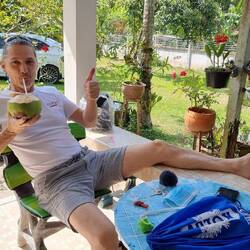 Wiedrum ein gemütlicher Morgen im Garten von Öng. Kokosnuss-Pflücker schneiden die Nüsse mit einem langen Sichel-Stiel ab - aufpassen, nicht drunter stehen🥴.