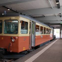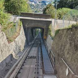 We squeezed into an already full cable car, the last 2 of about 80 passengers and the doors closed. It was about then that the little girl beside us started screaming and grabbing at the door handles. The screaming continued for the full 4 minute ascent and also after we disembarked. Knowing Jackie's love of cable cars, I am sure the child was vocalising what she was feeling inside. The train waiting for our arrival was a small narrow gauge single coach with doors at either end so we hastily headed the opposite end from the still screaming child.