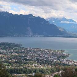 For our final treat of the day, we took the Funicular up Mt. Pèlerin. At 3,540 feet above sea level it is easily into the mountain classification, but with the summit covered in trees rather than snow and with Lake Geneva already at over 1200 feet, it looks more like a tall hill than a mountain. There are clusters of houses all way up the slope and the car soon filled with the excited shouts of school children returning home. The views of Lake Geneva and the towns of Montreux and Vevey below, with the backdrop of the French Alps across the water, were spectacular and we spent a lovely half hour sitting in the sun drinking it all in (the view - no wine involved).Leggi altro