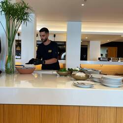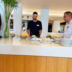 An Tag 3 hatte sich heute schon so etwas wie Routine eingeschlichen. Um dem Ritual aus morgendlichem Chillen, königlichem Frühstück und Strand etwas zu entkommen, hatten wir uns heute für einen Kochkurs eingeschrieben. Dieser wurde vom Hotel angeboten und konnte kostenfrei besucht werden. Auf dem Programm standen Gemista ( gefülltes Gemüse), Xoriatiki ( griechischer Dorfsalat) und Tzatziki (pikanter Joghurt- Dip mit Knoblauch und Gurke). Wir freuten uns sehr aufs Schnibbeln, Rühren und Brutzeln aber der Kochkurs stellte sich als ,,Kochshow“ heraus. In einem sehr kleinen Kreis zeigte und erklärte uns Theo ( der Küchenchef des griechischen Spezialitäten- Restaurants hier im Haus) wie die Gerichte zubereitet werden, zu unserer großen Freude durfte nebenbei verkostet werden. Über die anfängliche Enttäuschung nicht selbst Hand anlegen zu dürfen, waren wir recht schnell hinweg. Zum einen gibt es ja Schlimmeres als leckeres Essen zu bekommen, ohne was dafür tun zu müssen und zum anderen waren Theos Vorführungen und Erklärungen sehr charmant und unterhaltsam ( wir haben sogar noch was gelernt). Außerdem war der Chefkoch selbst sehr lecker anzusehen und so verging die Stunde wie im Flug. Anschließend haben wir uns dann, das erste Mal, im Pool erfrischt, und ich meine wirklich erfrischt, weil er deutlich kühler als das Meer ist. Dann folgte das abendliche Ritual sich fürs Abendessen herzurichten. Nach dem Dinner waren wir wirklich voll und machten noch einen kleinen Verdauungsspaziergang durch die weitläufige Anlage, bevor wir uns zur Beach Bar auf machten. Hier gab es heute Live- Musik, die Band hat gute Stimmung gemacht und 2 Stunden durchgezogen. So geht wieder ein Tag zu Ende. Gute Nacht 😴.Læs mere