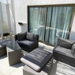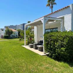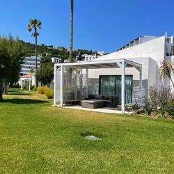 Nach dem Frühstück haben wir dann unsere Strandtasche gepackt und wollten uns auf den Weg zum Meer machen, allerdings nicht ohne vorher einen kleinen Streifzug durch die Anlage zu machen. Das DAMA DAMA besteht aus zwei Haupthäusern mit Hotelzimmern, sowie einem Garten mit einigen kleinen Bungalows. Im zentralen Teil befindet sich das Hauptrestaurant, sowie ein riesengroßer, nett angelegter Pool mit recht vielen Liegen (inklusive) und ein paar gemütlichen Daybeds ( kostenpflichtig auch bei All-Inn, 50€ pro Tag). Im hinteren Teil der Anlage befindet sich ein Frischwasser Pool mit einer Wasserrutsche und einer Liegewiese. Eine weitere kleine Liegewiese mit Liegen trennt den Poolbereich vom
