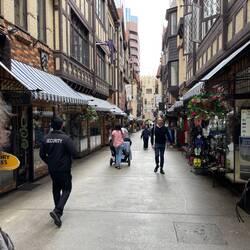 Eine kleine Gasse im englischen Stiel von 1937 mit ein paar kleinen Geschäften und Cafés.