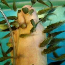 Als wir den Fluss entlang geschlendert sind hab ich einen tollen Laden entdeckt. Dort kann man für 30 RMB, das sind umgerechnet 3,78 € seine Füße 20 Minuten in ein Fischbassin mit kleinen Fischen hängen. Kerstin hat verweigert wegen zu teuer, Joachim hat verweigert wegen zuviel Hornhaut, ich hab gemacht. Es dauerte 20 Minuten. Ich hab zu ihnen gesagt sie sollen noch etwas rumschlendern ich finde sie dann wieder. War ja ein kleines Dorf. Sie sind dann rumgeschlendert und ich bin da rein. Als ich in den Laden rein bin, war ich der einzige Kunde, als ich wieder raus bin war der Laden voll. Nichts bringt in China wohl bessere Werbung als ein Europäer :). In Deutschland verwendet man das mit den Fischen unter anderem bei Leuten mit starker Neurothermitis und bei Verbrennungsopfern um möglichst sauber, schmerzfrei und hygienisch die abgestorbene Haut zu entfernen. Beim letzten nachzählen hatte ich durch die Lauferei 5 Blasen die alle am verheilen waren. Die Chance für die Fische sich eine europäische Mahlzeit einzuverleiben. Es kitzelt. Es kitzelt wie sau. Ich musste immer wieder kichern. Nach und nach hat sich der Laden mit Chinesen gefüllt die das dann auch mal ausprobieren wollten. Und ich musste wieder für Chinesen für ein Foto posieren. Diesmal war es eine junge Chinesin die sich neben mit gesetzt hat und meine Hand geschnappt hat und und wir mussten ins Iphone grinsen. Man kann ihnen leicht eine Freude machen! :)